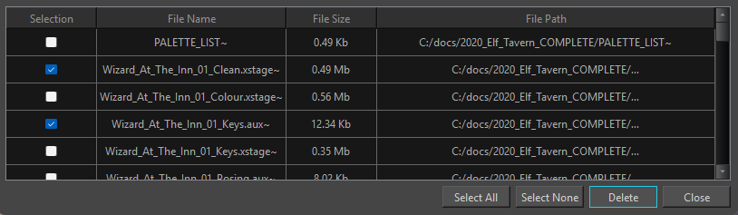 The Optimize Backup Files dialog only lists files that are unused in your Harmony scene. The backup files that appear in the Optimize Backup Files dialog are listed by file name, file size and the file path.