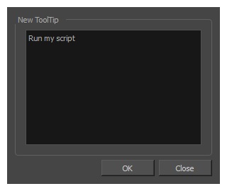 If you want to add a custom tooltip to the toolbar button for your script, click on the Customize Tooltip button and, in the dialog that appears, type in the tooltip for your toolbar button.