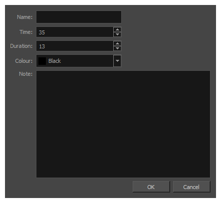 Using the Marker dialog, you can create a scene marker on a single frame or a range of frames, and give it a name, a description and a specific colour if you want.