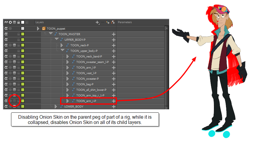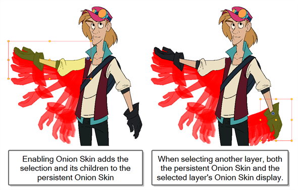 This makes managing Onion Skin while doing cut-out animation relatively seamless. However, you may still want to manage which layers are visible in the Onion Skin. For example, you may want to add more layers to the Onion Skin as their position is needed to help you pose specific layers, or you may want to remove layers from the Onion Skin to de-clutter it, or prevent it from hindering software performance. There are several techniques for managing which layers are displayed in the Onion Skin.