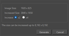 The Increase Image Resolution operation will increase the resolution of your imported image. The Increase Image Resolution dialog will give you the option to scale your image resolution up by a scale factor of 2 or 4.