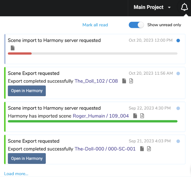 After issuing an export request, the feed will follow the progress of the request. An “Open in Harmony” button is generated once WebCC has finished processing the export (although, in some cases, the file may not be available yet to the remote user). Hovering the file icon will display the file name and clicking on the log will pop up the export log, including WebCC response.