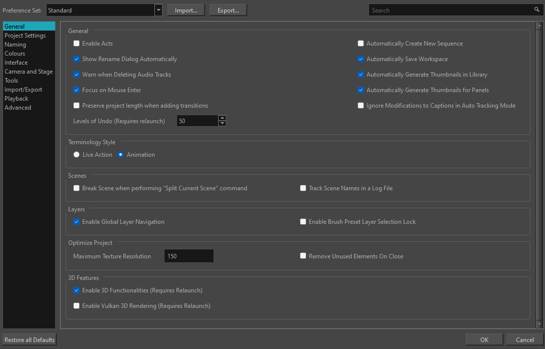 Preferences(環境設定)ダイアログボックスでは、ワークフローおよび製作ニーズに沿うよう選好を調整することができます。