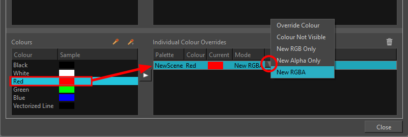 - 仅新 RGB:覆盖色卡的 RGB 值,同时保持其原 Alpha 值。您可以单击色卡,然后从“颜色拾取器”窗口中选择一种新颜色。