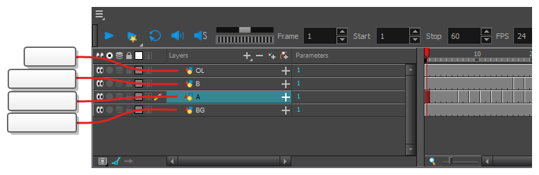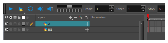 新场景只会默认创建一个图层,名为绘图图层。传统动画中通常使用单个字母(A、B、C 等)命名动画图层,使用首字母缩写命名构图图层(BG 表示背景,OL 表示顶层等)。因此,您可以通过为第一个图层指定合适的名称来开始创建场景。