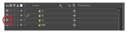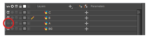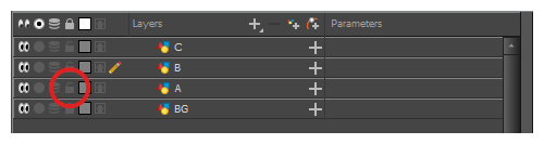 您可以暂时锁定图层。锁定的图层仍然可以在“时间轴”或“摄影表”视图中进行编辑,但不能在“摄像机”视图中选择、绘制或操作。这有利于避免意外选择或绘制目前不在作业中的背景、顶层、道具或角色。