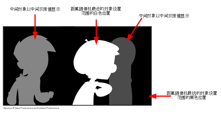 “深度视图”模式以从白到黑的相对渐变色阶显示图像。离摄像机最近的对象显示为白色,离摄像机最远的对象显示为黑色。如果最后一个对象的位置沿 Z 轴发生变化,只要该对象的位置保持在最靠后的位置,则仍将显示为黑色。该对象在 3D 空间中的位置并不重要,重要的是它相对于同一空间中其他对象的位置。距离摄像机最近和最远的对象设定从白到黑的色阶范围。所有其他对象的颜色落在这一范围之内。