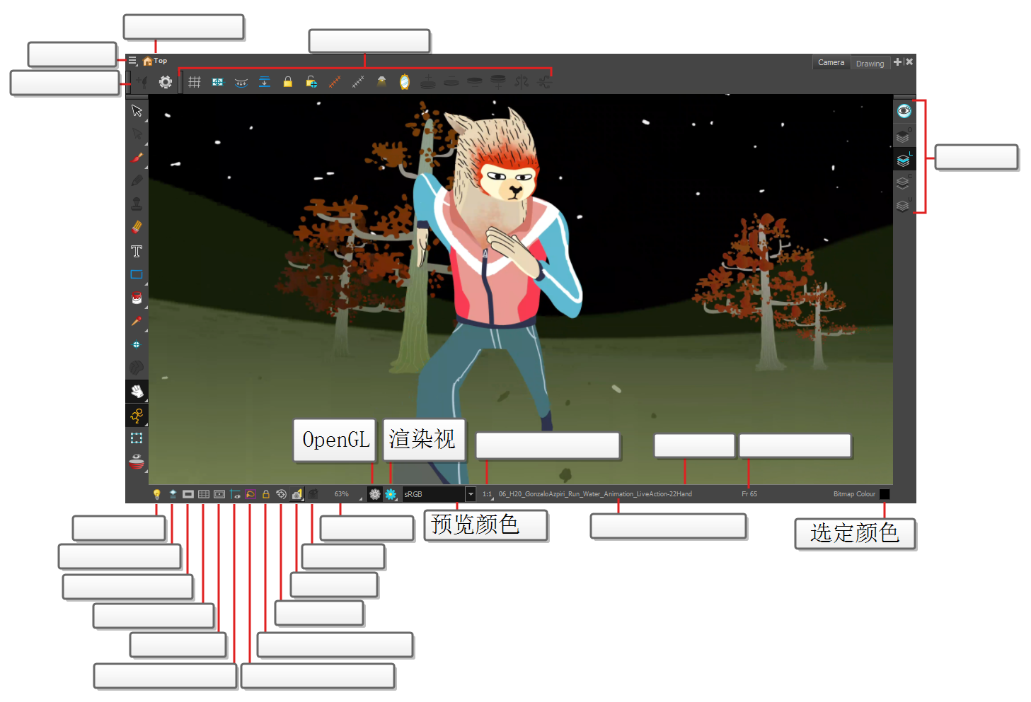 “摄像机”视图是 Harmony 的操作中心。在此视图中,可以进行绘制、着色、生成动画、设置场景、操作对象、打开元件和预览动画。