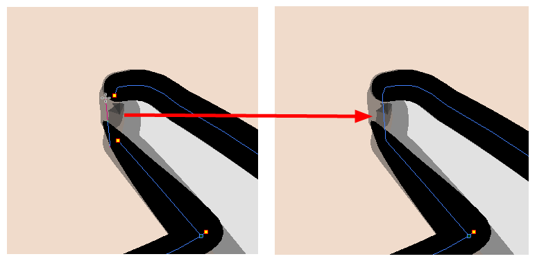 着色时,可能发现绘图的某些区域由于轮廓中的小缺口而没有完全闭合,这会导致“着色”工具无法填充该区域,因为“着色”工具只能填充闭合的形状。要闭合该区域,可以使用“笔刷”或“铅笔”工具,在缺口上绘制一条线。另外,还可以在缺口上添加隐形线(“着色”工具会将其视为普通线)从而将缺口闭合。在 Harmony 中,用于定义着色区域的隐形线被称为线条