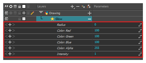 将出现该特效在“时间轴”视图中可用的参数列表。