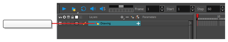 新场景只会默认创建一个图层,名为绘图图层。传统动画中通常使用单个字母(A、B、C 等)命名动画图层,使用首字母缩写命名构图图层(BG 表示背景,OL 表示顶层等)。因此,您可以通过为第一个图层指定合适的名称来开始创建场景。
