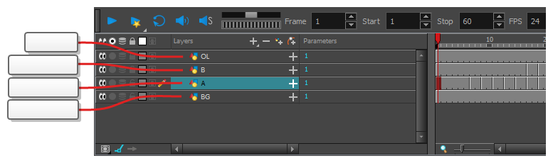 和传统动画一样,Harmony 使用图层来使角色、背景和道具等元素彼此分离,以便独立创建它们的动画。