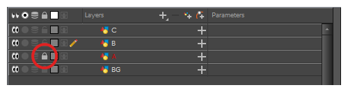 您可以暂时锁定图层。锁定的图层仍然可以在“时间轴”或“摄影表”视图中进行编辑,但不能在“摄像机”视图中选择、绘制或操作。这有利于避免意外选择或绘制目前不在作业中的背景、顶层、道具或角色。
