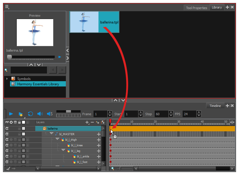 如果模板与场景的一部分的图层结构相同,则可以将模板直接放在“时间轴”视图右侧的帧上。这将把场景中的绘图和关键帧替换为模板中的对应项,而不是将新图层插入场景。这可用于为已经处于场景中的角色导入姿势或动画模板。