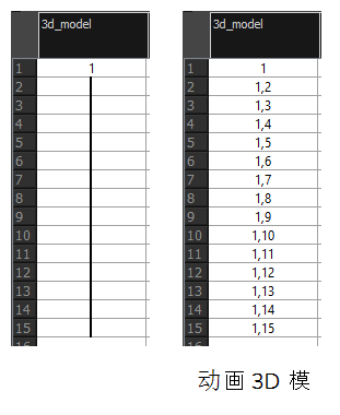 3D 模型本身是一张绘图,通常命名为 1,它必须在整个场景中曝光。为了指明场景的某一帧中要曝光 3D 模型内部的哪个动画帧,您可以在“摄影表”的单元格中输入绘图的名称,后面跟一个逗号和要曝光的模型动画帧的编号。