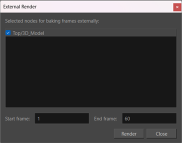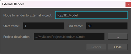 “外部渲染”对话框会显示将要渲染的“3D 模型元素”节点,并允许您定义将要渲染的帧范围。此外,“项目目标位置”字段允许您定义新烘焙文件的保存路径。