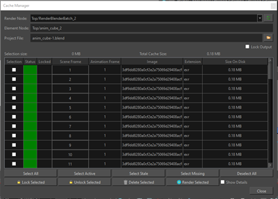 该实用工具能够显示外部 3D 项目的缓存渲染,并提供锁定和/或分配帧以及删除磁盘上缓存文件的功能。“缓存管理器”还允许您查看缓存图像的大小,以及包含所有缓存项的文件夹的总大小。