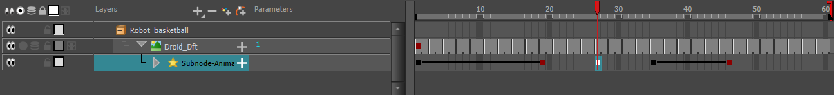 可以在 Harmony 中操作 3D 序列的关键帧。动画序列将以绘图替换的形式显示在“时间轴”视图中。任何变换或补间帧都会在动画中施加偏移,可以使用“子节点动画”节点设置偏移。