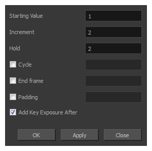注释 有关“摄影表”的“序列填充”对话框的更多信息,请参阅:播放 Harmony 场景中 3D 模型的动画