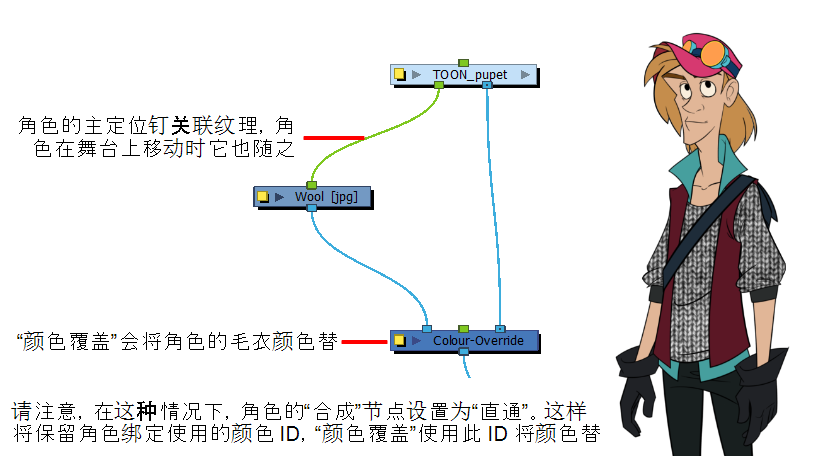 “根据渲染变化填充曝光”命令可应用于任何图层,但最常见的使用情况是,包含纹理绘图的图层通过其纹理端口被“颜色覆盖”功能调用,以实现将角色的颜色替换为纹理的效果。为了让“根据渲染变化填充曝光”命令能够切换不同的纹理,包含纹理绘图的绘图图层至少应有多张不同的纹理绘图。有关此方法的更多信息,请参阅用纹理序列覆盖颜色。