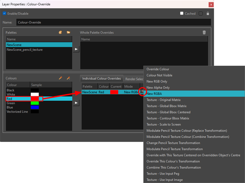 - 仅新 RGB:覆盖色卡的 RGB 值,同时保持其原 Alpha 值。您可以单击色卡,然后从“颜色拾取器”窗口中选择一种新颜色。