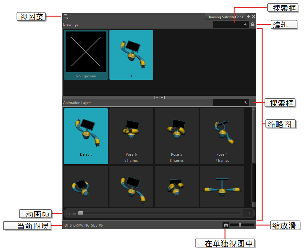 “绘图替换”视图允许您在缩略图列表的选定图层中查看所有绘图,也使您可以快速选择在当前帧曝光的绘图。