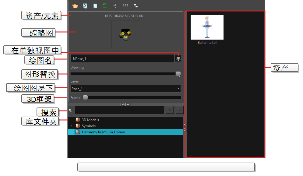 “文件库”视图用于存储诸如动画、绘图、背景和角色模型之类的元素,以便在不同场景和项目中重复使用。还可以使用“文件库”视图来创建和存储元件,以及存储和导入图像、声音文件和 3D 模型