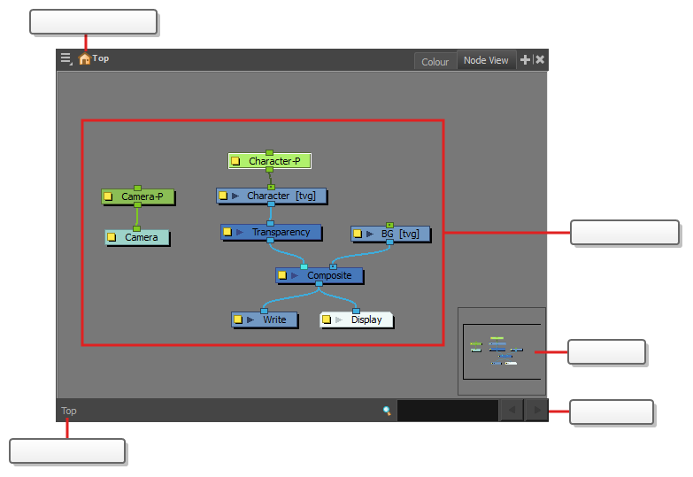在“节点”视图中,可以连接特效和合成节点以组成网络(也称为节点系统)。该视图对于绑定木偶、创建高级特效以及清楚查看复杂场景很有用。节点的组织和顺序确定合成过程中的数据流以及动画元素的合成方式。