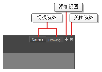每个视图顶部均有一个包含视图名称的选项卡。选项卡不仅可以用来识别您所工作的视图,还使您可以在用户界面的相同区域堆叠多个视图。例如,在默认工作区中,“摄像机”视图占用了大部分区域。“摄像机”视图顶部有两个选项卡,一个是摄像机,另一个是绘图。这是因为“绘图”视图与“摄像机”视图堆叠,您可以通过点击任一选项卡在两者间快速切换。