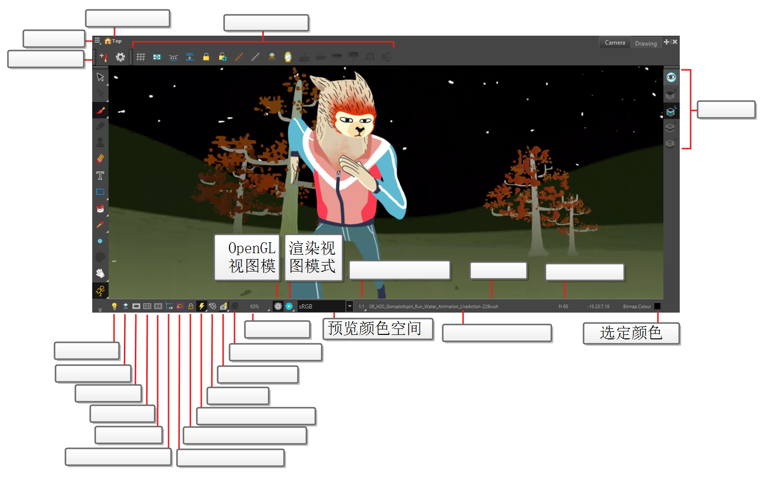 “摄像机”视图是 Harmony 的操作中心。在此视图中,可以进行绘制、着色、生成动画、设置场景、操作对象、打开元件和预览动画。