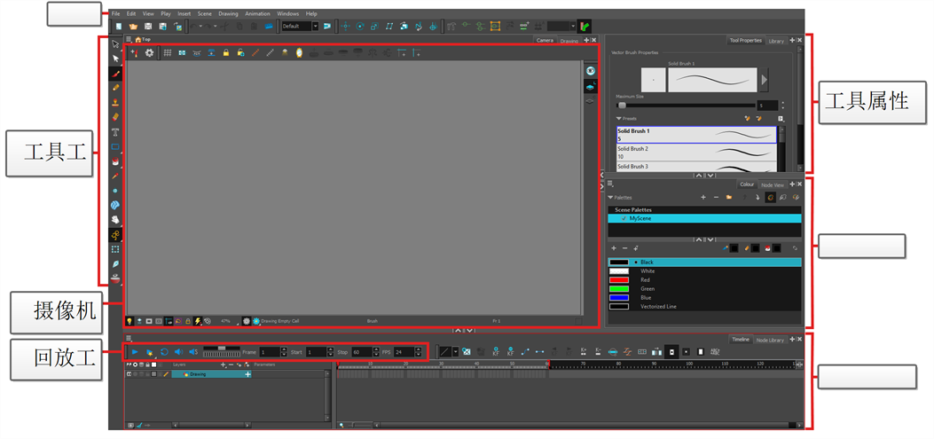 先熟悉 Toon Boom Harmony Premium 的用户界面,再使用起来会容易得多。以下章节将对用户界面的最重要元素进行基本介绍。阅读接下来的章节时,您将能了解有关用户界面中每个元素的更多详细信息。
