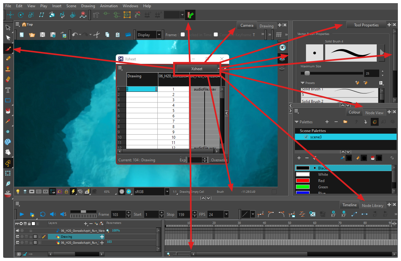 “摄影表”视图可用于纵向读取时间,方法是将时间显示在网格中,每个绘图图层由一个列表示,场景的每帧由一行表示,每个曝光绘图的名称显示在单元格中。使用方法就像传统动画曝光表一样。