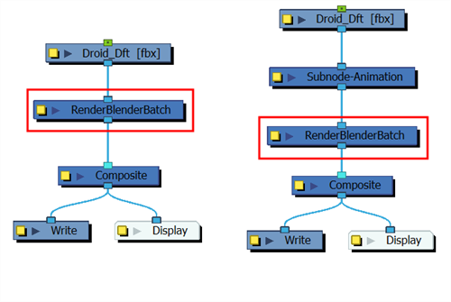 • 渲染节点:“渲染节点”操作通过外部 3D 软件渲染 3D 场景。所有渲染都会出现在场景的元素文件夹的缓存中。这意味着,在首次渲染之后,当您在“渲染”视图中浏览帧时,3D 软件将不再需要重新渲染材质。