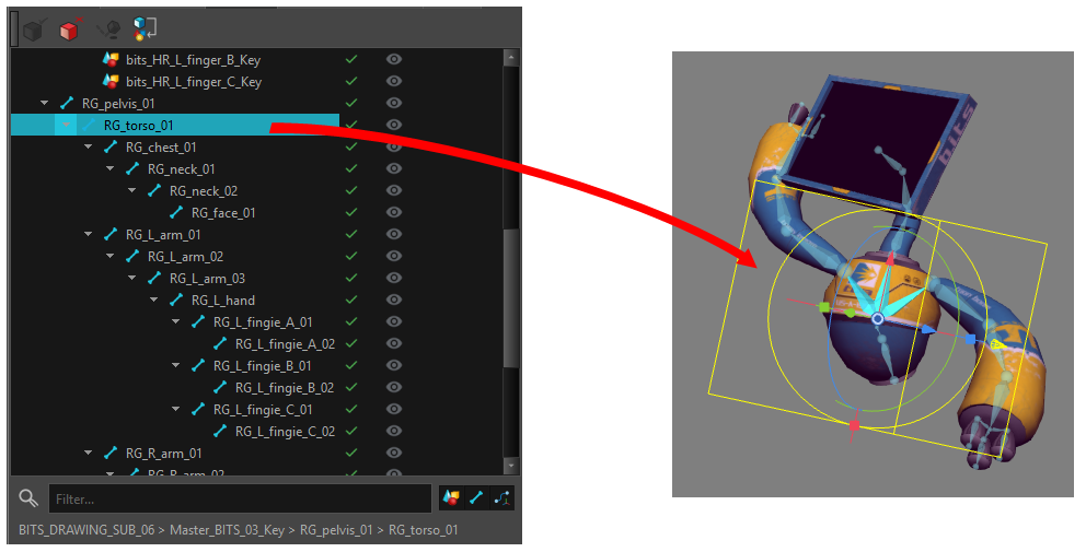 • 骨骼子节点:表示 3D 模型骨架中的所有骨骼。每个骨骼将根据其在骨架层级中的位置列出。通过对骨骼进行绑定和调整,可以实现对 3D 对象网格的变换,从而影响几何形状。