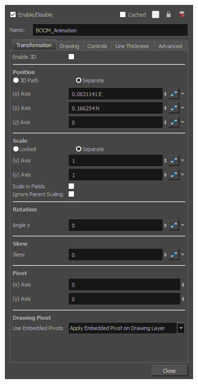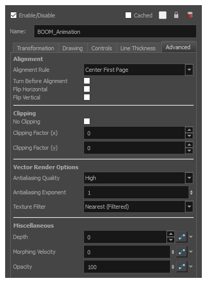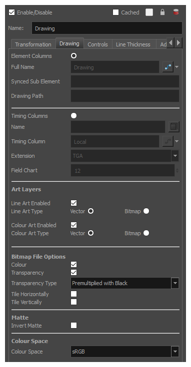 名称:元素所链接的绘图文件的路径。 定时列:用于图层定时的摄影表定时列的名称。 扩展名:元素所链接的绘图文件的扩展名。 规格框坐标图:元素链接的绘图所使用的规格框坐标图大小。此设置在链接到传统动画绘图时很有用。 |
