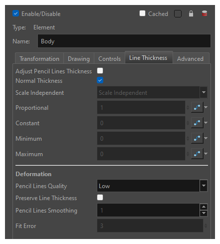 使用动画工具创建动画:默认情况下,可以为绘图图层直接创建动画,就像它是自己的定位钉一样。如果禁用此选项,则只能使用其父级定位钉为图层创建动画。如果图层没有父级定位钉,则无法创建动画。 如果希望创建只能使用定位钉添加动画的 cut-out 角色绑定,此选项将很有用,它有助于将绘图曝光与绘图上的变换分离开来。如果角色绑定中的每个绘图图层都禁用了此选项,则只有具有父级定位钉的图层才能动画化,动画师只能在定位钉上创建动画。这也排除了意外直接使某个元素动画化,同时使用其父级定位钉的可能性。 禁用此选项时,在带有“变换”工具的“摄像机”视图中单击绘图图层将自动选择该图层的父级定位钉。 |