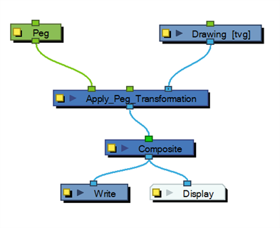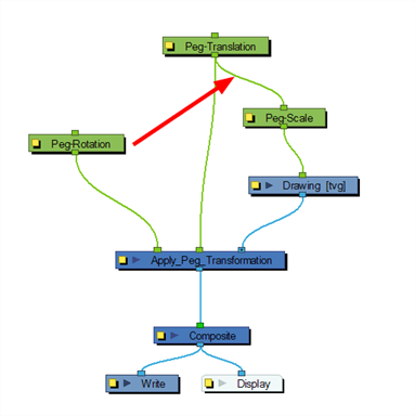 当没有“应用定位钉变换”节点时,Peg-Translation(定位钉-平移)是第一个影响绘图节点的轨迹。然后,一旦应用平移,Scale(缩放)轨迹就会影响绘图节点。