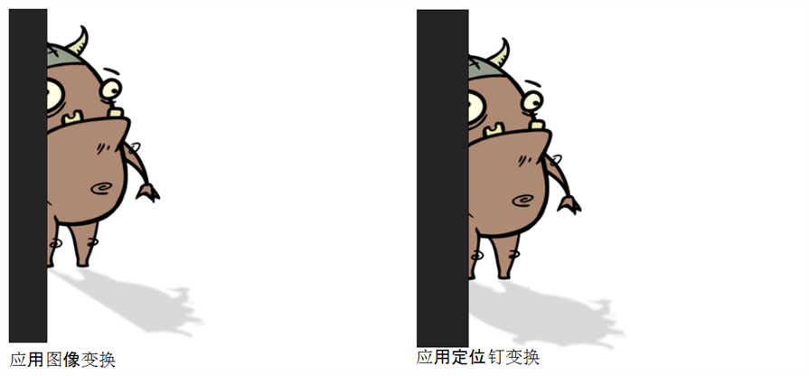 在下面的图像中,可以看到不使用“应用定位钉变换”节点和使用该节点时的变换结果:
