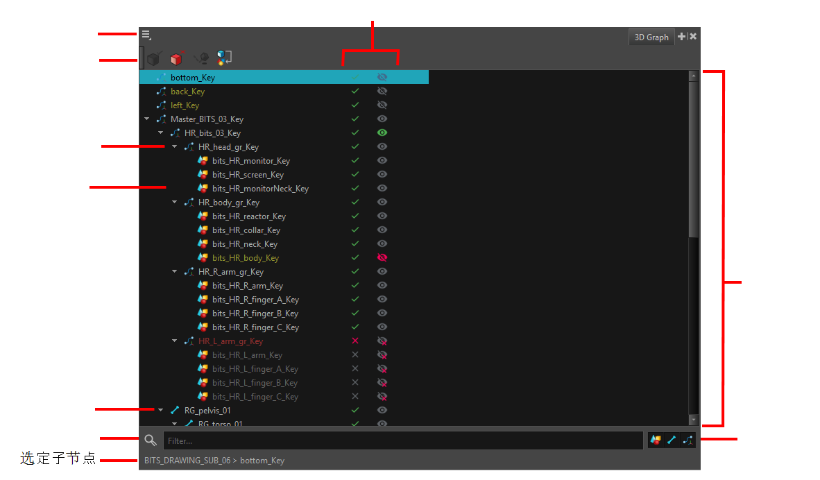以树状层级结构列出选定 3D 模型的子节点,并允许选择子节点。 注释 前面带有