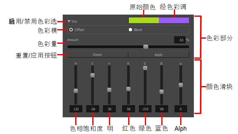| 重置 | 在色彩模式下,这会将所有颜色滑块设置为中性值,所选颜色保持不变。 |
