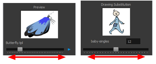 此外,通过“文件库”视图的“绘图替换”面板,您可以将当前帧的曝光迅速更改为一个图层中的现有绘图之一。这在为 cut-out 角色的口、手、眼皮和其他身体部位生成动画时尤其有用,因为它们一般包含多个绘图可供选择。