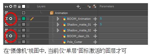 单层模式支持在“摄像机”视图中仅查看特定图层,而隐藏所有其他图层。在一个图层上启用单层模式后,只有该图层可见。如果在多个图层上启用了单层模式,则只有这些图层可见。如果未在任何图层上启用单层模式,则所有启用的图层都可见。