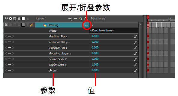 还可以在“时间轴”视图中访问图层的参数。单击“展开参数” 按钮即可。