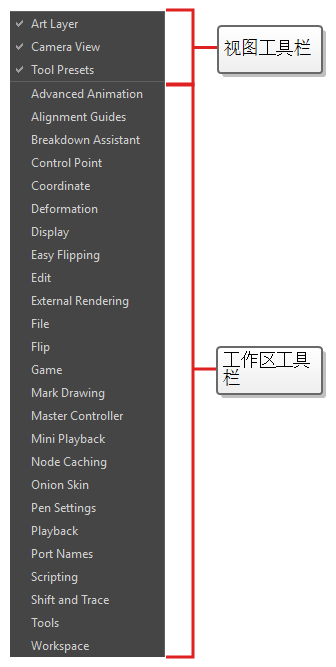 注释在视图快捷菜单的工具栏列表中,分隔符上方所列工具栏为工作区工具栏,下方为视图工具栏。