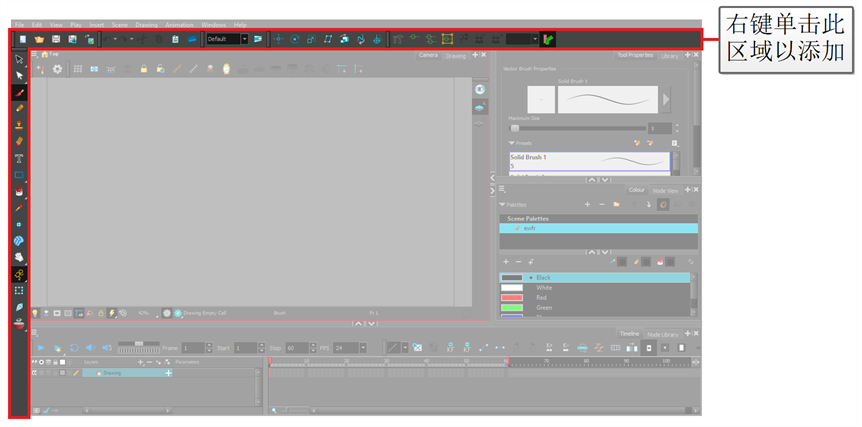 - 工作区工具栏添加到某一个与其他视图堆叠的视图时,它在每个堆叠于同一区域的视图中都可见。例如,如果将“高级动画”工具栏添加到“摄像机”视图中,它也会在“绘图”视图中可见。