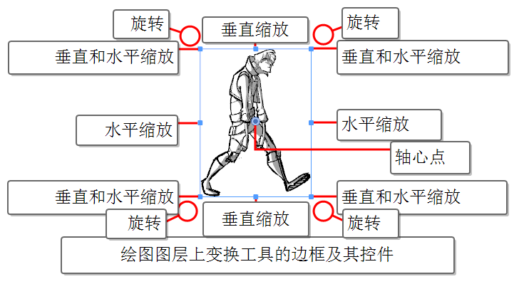 在“舞台”或“摄像机”视图中,“图层变换”工具的控件显示在所选绘图图层周围。