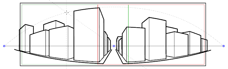 • 三点透视(垂直平移)参考线可帮助您绘制具有曲线垂直线的垂直全景背景。一个消失点位于视平线中间,辅助在 z 轴上绘制线条;两个消失点分别位于摄像机框外的视平线的上方和下方,用以定义垂直线的曲度。水平线平行于视平线。