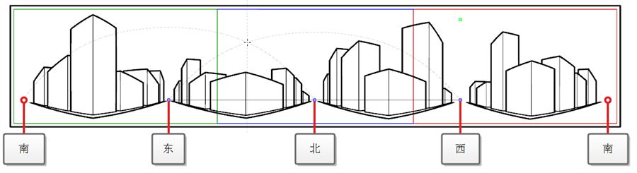 该参考线使用 5 个消失点。绘制水平线时,该线条会向其中一个消失点拱起并向下延伸至旁边的两个消失点,使其显得弯曲。这样便形成了一种透视效果,其中每个消失点各代表一个基本方位点(但最左侧和最右侧的两点代表同一基本方位点),有效实现循环背景。使用“四点连续透视”参考线制作的背景可以水平循环,模拟摄像机绕 y 轴旋转一周的视觉效果。