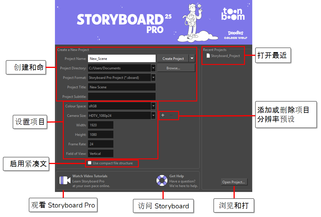 Storyboard Pro 启动后,出现“欢迎”界面,在此可以: