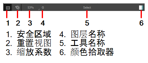 状态栏位于“顶视图”和“侧视图”的底部,包含多种工具,可用于查看 3D 对象、识别图层名称、了解当前工具,以及访问“颜色拾取器”工具。